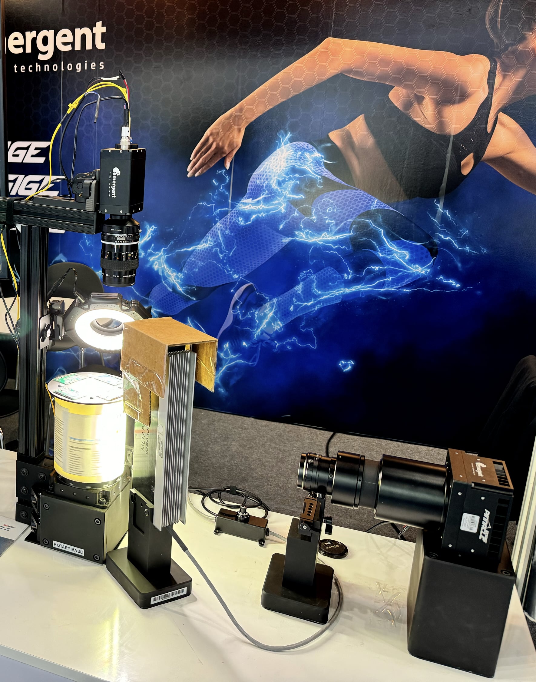 This demo has a linescan running with a single rotary stage using its built-in encoder. The LZ-16KG5-M has a 400KHz line rate and a 16Kx16 resolution while the LZT-9KG5 has a 608KHz line rate and a 9K 256TDI resolution. These linescan cameras are the fastest monochrome line scan cameras with a 100GigE interface, scanning a printed sheet of paper on a drum rotating on the vertical axis. Emergent eCapture Pro and eSDK are used for best in class zero copy driver performance. GigEVision 3.0 RDMA/RoCEv2 is also used in this demo seen as the fasted deployed solution for RoCEv2 for the new addition to the GigEVision standard slated for release in 1-2 years.